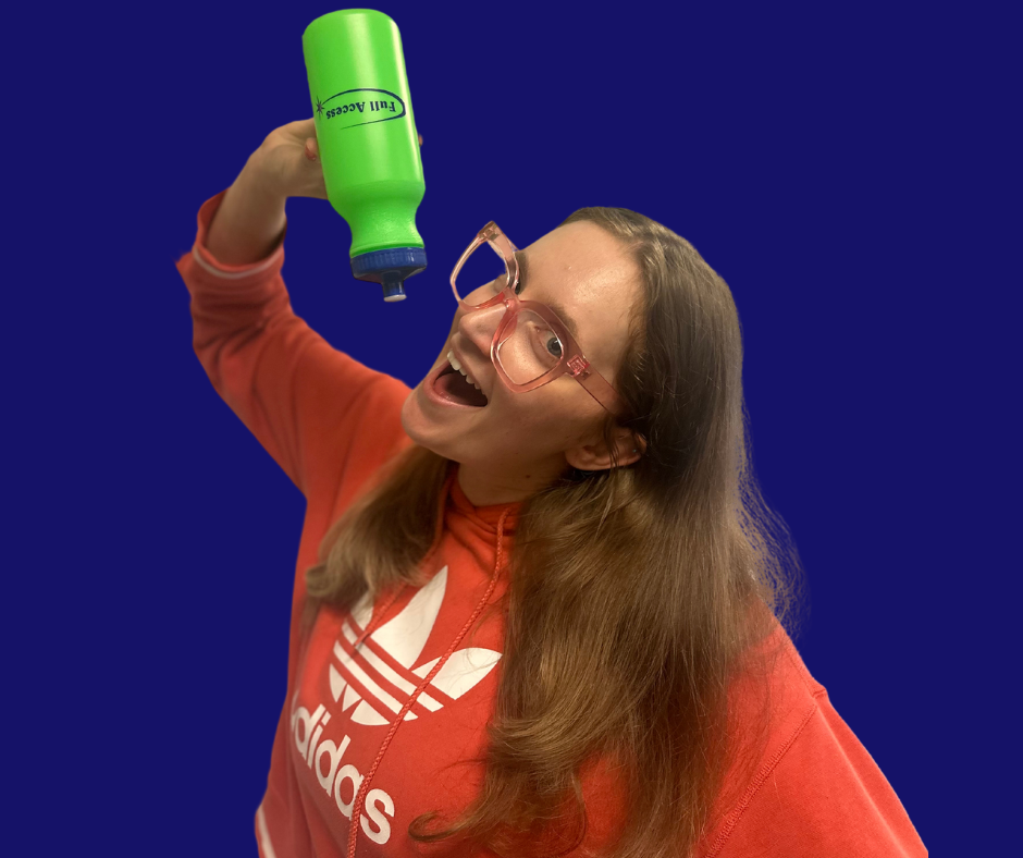 Show your support for Full Access with our vibrant neon green water bottle featuring the Full Access logo and a blue lid. Grab yours today!